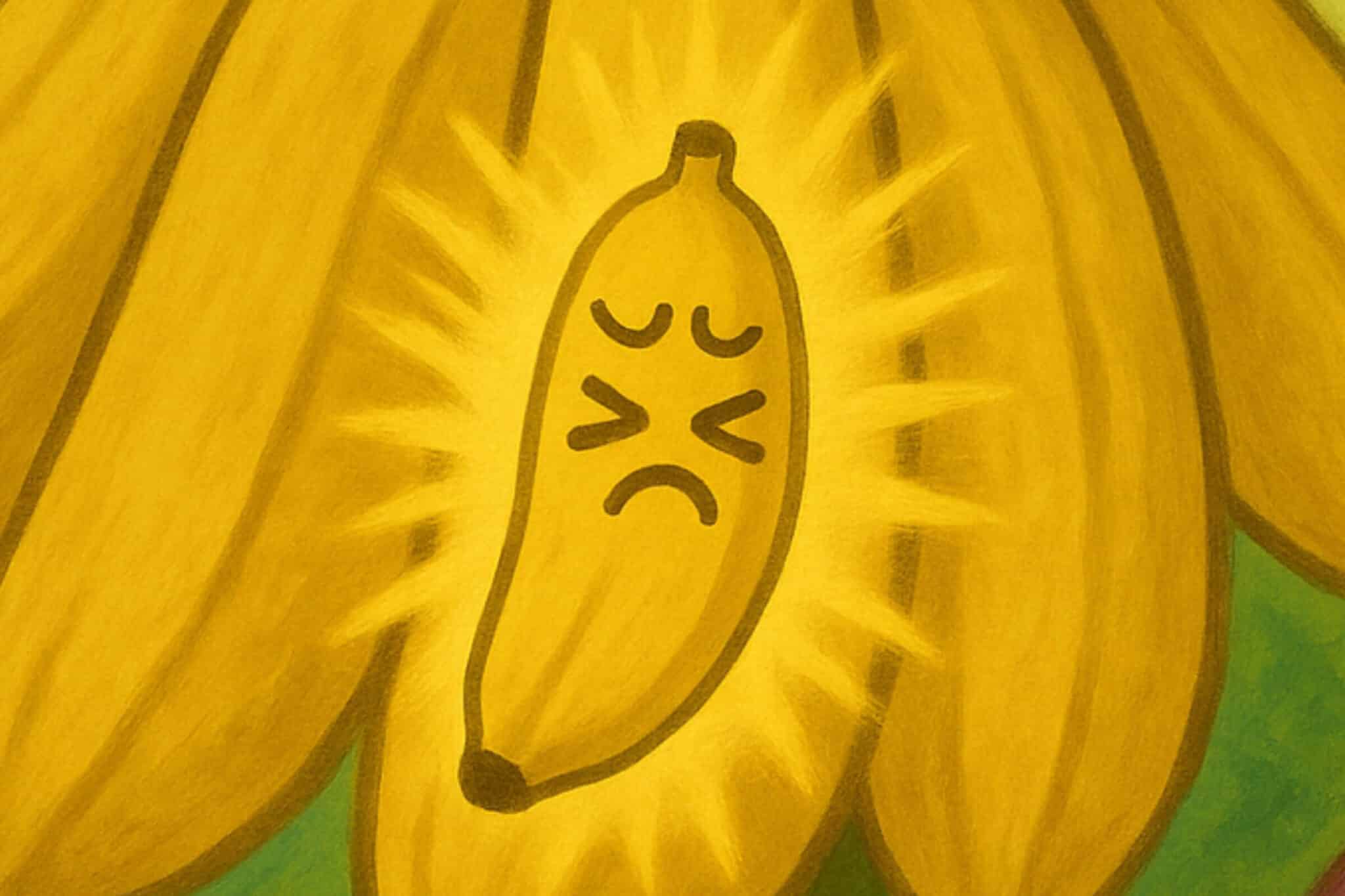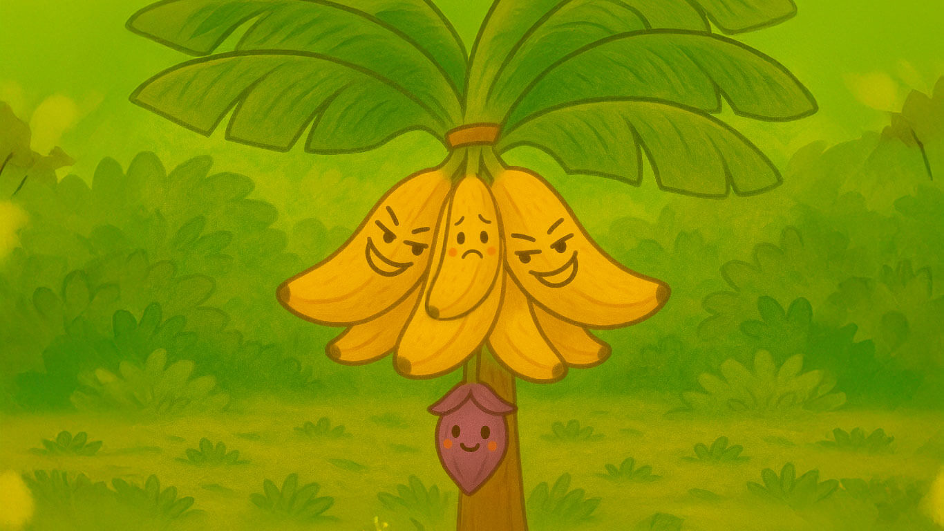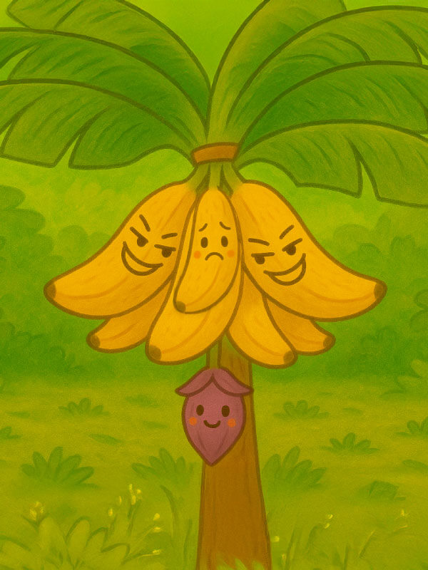 Lama-kelamaan, dia tumbuh menjadi pisang emas yang benar-benar cantik, dengan warna kuning yang berkilauan dan rasa yang manis sekali. Semua pisang yang lain terpegun melihatnya.